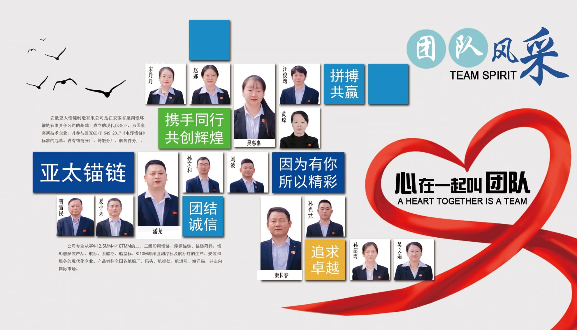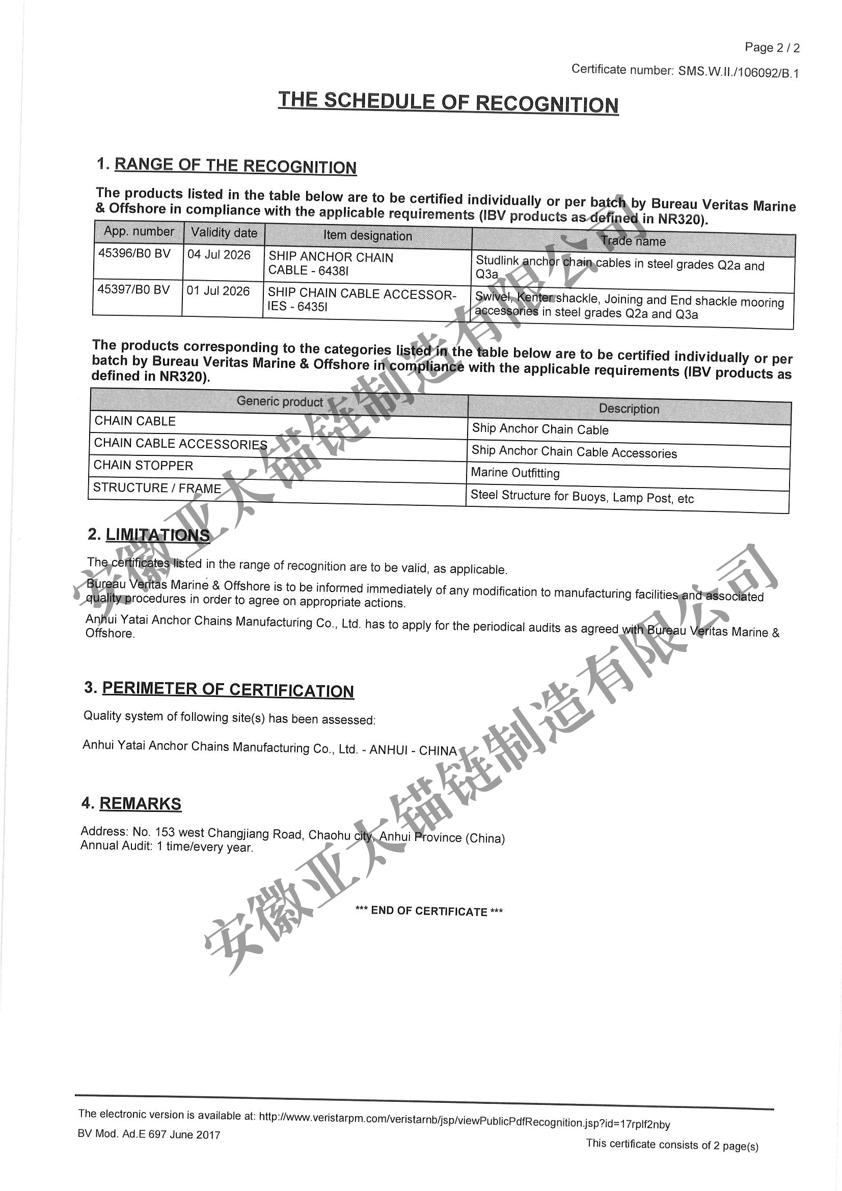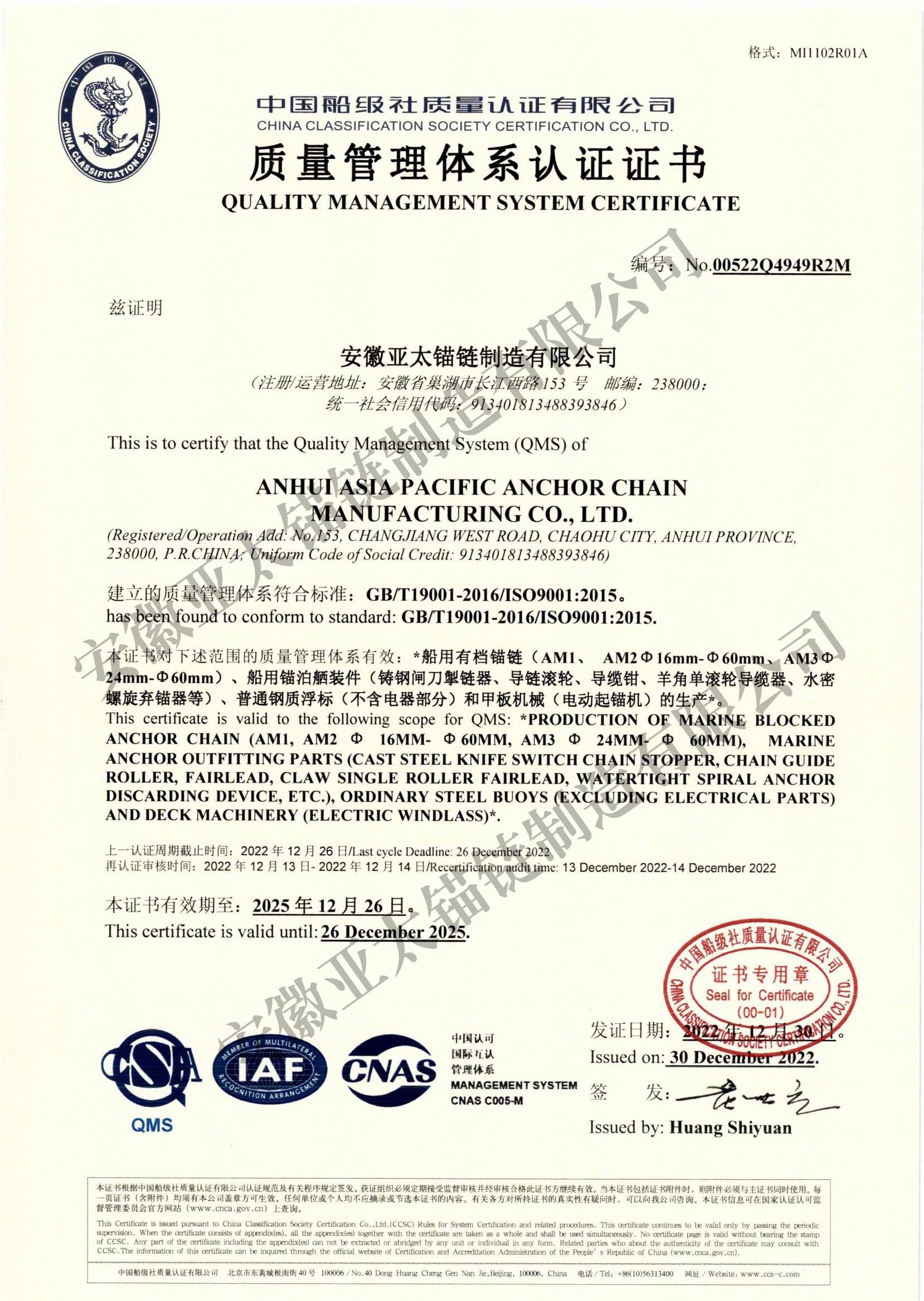 安徽亞太錨鏈制造有限公司是國家高新技術企業(yè),也是國家GB/T 549-2017《電焊錨鏈》標準的起草和制定單位之一。公司旗下設有錨鏈分廠、浮標分廠、舾裝件分廠等多個分廠。公司專業(yè)從事φ12.5mm-φ107mm二、三級船用錨鏈、浮標錨鏈、錨鏈附件,錨、船舶曬裝產(chǎn)品、航標、系船浮、船型標、多種規(guī)格海洋監(jiān)測浮標及航標燈等產(chǎn)品的生產(chǎn)、安裝和服務。目前公司的產(chǎn)品銷往全國各地船廠、碼頭、航標處、航道局、海洋局,并已走上國際市場,如東南亞、中東、歐美等國家。